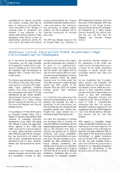 NEWS establishment of national reconcilia- to play a pivotal political role; “coup as APR Organising Committee and Chief tion centres, “3‐stage road map for intermittent interludes between demo- Executive of ISIS Malaysia. IDFR was return to democracy, with elections,” cratic parliamentary rule;” parliamen- represented by Ms. Norani Ibrahim, “more than 80% of the 700‐plus TV tary democracy as default political Deputy Director General (T), Ambassa- channels return to operations” and position; and the constitution will be dor Aminahtun Hj. A. Karim, Deputy etcetera. It was predicted in the amended occasionally for example Director General (C), Ms. Rafizah Zahri session that barring unforseen major post-coup. and Ms. Lim Hui Chin from the disruptions, there will be a return to Regional and Security Studies parliamentary democracy before the The APR was officially closed by Tan Division. end of 2015; the military will continue Sri Rastam Mohd Isa, Chairman of Address by H.E. Rod Smith PSM, Australian High Commissioner to Malaysia On 17 June 2014, the Australian High enmeshed in the forums of the region, and economic interests. Situated at Commission and the Asian Strategy proudly multicultural and confident of the intersection of the Pacific and and Leadership Institute (ASLI), orga- its place in our neighbourhood.” Indian Oceans, Southeast Asia acts as nised an Address by H.E. Rod Smith, Australia is also a member of the G20, a fulcrum for the rapidly intensifying the Australian High Commissioner to with the world’s 12th largest GDP as exchange of goods, people and Malaysia held in Double Tree Hilton, well as the 5th highest GDP per capita knowledge between East, West and Kuala Lumpur. and was the only developed country to South Asia. avoid recession during the global The Address was attended by officials financial crisis. He further stated that He also highlighted that “Australia’s from Wisma Putra and other govern- “Australia is forecast to realize average future security and prosperity will ment agencies, members of the diplo- annual real GDP growth of 3% depend heavily on the region remain- matic corps, politicians, business between 2012 and 2018, the highest ing peaceful, secure, stable and pros- leaders, think tanks, representatives forecast among major advanced perous.” In short, Australia’s interests from universities and media. IDFR was economies.” are best served by a stable balance of represented by Ms. Norani Ibrahim, power in Asia that encourages Deputy Director General (T), Ambassa- H.E. Rod Smith also spoke about the economic integration, inclusive and dor Aminahtun Hj. A. Karim, Deputy economic transformations of Asia. He outward looking. There is therefore a Director General (C) and Ms. Lim Hui believes that Australia has been a need to build a comprehensive Chin from the Regional and Security beneficiary of this phenomenon and relationship with Asia. This explains Studies Division. that its prosperity over the last decade Australia’s continued support for and benefited greatly from China’s rise. engagement with the ASEAN Regional In his Address, H.E. Rod Smith spoke Despite that, Japan remains one of Forum, the ASEAN Defence Ministers on Australian Foreign Policy and a Australia’s largest trading partners. Plus process and the East Asia Region in Transition and offered a brief Summit. overview of Australian economic He noted the importance of ASEAN development since 1960s. He stated and Southeast Asia to Australia. He With regards to Australian foreign that through a broad and aggressive said that ASEAN is Australia’s second policy, he said that Australia has a very reform agenda in the 1980s and largest trading partner after China. It is clear focus on the Asian region but not 1990s, Australia has transformed from also a vital institution that plays a to the exclusion of the world beyond. an insular, highly regulated economy cohesive and positive role in regional Australia has long-established links to with inefficient public sector monopo- economic and social integration. other parts of the world and a strong lies, low productivity and growth as Australia’s links with ASEAN are varied commitment to global institutions well as poor comparative economic and deep. This year Australia comme- such as UN and WTO, and internatio- performance into an open, dynamic, morates the 40th anniversary of its nal law. This year, Australia holds a flexible and high-productivity econo- formal dialogue partnership with seat at the UN Security Council and is my. ASEAN and is proud to be ASEAN’s pleased to be supporting Malaysia’s first dialogue partner and to support candidacy for membership of the According to him, “Australia today is ASEAN’s role at the centre of regional Security Council for the next term. globally engaged, economically open institutions. Southeast Asia is also and competitive, focused on Asia, fundamental to Australia’s strategic 28 bulletin@idfr.gov.my