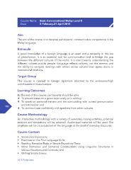 Course Name Basic Conversational Malay Level II Date 5 February-21 April 2015 Aim The aim of the course is to develop participants’ communicative competence in the Malay language. Rationale A good knowledge of a foreign language is an asset and a necessity in this era of globalisation. It is an essential tool for communication and to bridge the gap between the different cultures of the world. It is vital towards understanding the different cultures and its people. Language refects cultures, not the reverse, and the ability to navigate dealings with others across cultural lines opens doors in international relations. Target Group This course is opened to foreign diplomats attached to the embassies/high commissions in Kuala Lumpur. Learning Outcomes By the end of this course, participants should be able: U To present ideas on a given topic orally or in writing; U To speak on personal matters and the surrounding with correct pronunciation and intonation; and 102 U To communicate confdently with speakers from other cultures. Course Methodology An interactive methodology with a variety of awareness-raising activities, practical sessions and simulations will be adopted. Audiovisual materials will be used. The emphasis will be on acquisition of the language at the level of everyday discourse. Course Content • Vocabulary Expansion; • Exercises on the Four Language Skills; • Reading Narrative Texts or Simple Expository Texts; • Word Formation and Sentence Constructions Using Linguistic Structures in Various Situations and Contexts; and • Writing Simple Essays. 2015 Prospectus