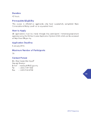Duration 42 hours. Prerequisite/Eligibility This course is offered to applicants who have successfully completed Basic Conversational Malay Level I or an equivalent level. How to Apply All applications must be made through the participants’ ministries/government agencies using the Online Course Application System (CAS) which can be accessed at http://cas.idfr.gov.my Application Deadline 8 January 2015. Maximum Number of Participants 20 Contact Person Ms. Wan Faizah Wan Yusoff Deputy Director E-mail : wanfaizah@idfr.gov.my Tel : +603-2149 1032 Fax : +603-2144 8704 103 2015 Prospectus