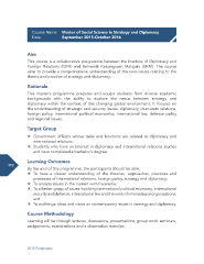 Course Name Master of Social Science in Strategy and Diplomacy Date September 2015-October 2016 Aim This course is a collaborative programme between the Institute of Diplomacy and Foreign Relations (IDFR) and Universiti Kebangsaan Malaysia (UKM). The course aims to provide a comprehensive understanding of the core issues relating to the theory and practice of strategy and diplomacy. Rationale This master’s programme prepares and equips students from diverse academic backgrounds with the ability to explore the nexus between strategy and diplomacy within the context of the changing global environment. It focuses on the understanding of strategic and security issues, diplomacy, inter-state relations, foreign policy, international political economics, international law, defence policy and regional issues. Target Group U Government offcers whose tasks and functions are related to diplomacy and international relations. U Students who have an interest in diplomacy and international relations studies and have completed a bachelor’s degree. Learning Outcomes 112 By the end of this programme, the participants should be able: U To have a clearer understanding of the theories, approaches, practices and processes of international relations, foreign policy, strategy and diplomacy; U To analyse issues in the current world scenario; U To a better grasp of issues involving international political economy, international security and defence, international law and the work of international organisations; and U To exchange ideas and views on contemporary issues in strategy and diplomacy. Course Methodology Learning will be through lectures, discussions, presentations, group work, seminars, assignments, examinations and a dissertation exercise. 2015 Prospectus