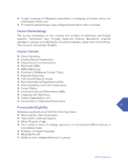 U To gain exposure on Malaysia’s experience in managing its foreign policy and international affairs; and U To network and exchange views with participants from other countries. Course Methodology The course emphasises on the concept and practice of diplomacy and foreign relations. Participants learn through classroom lectures, discussions, practical exercises in groups and individually, simulation exercises, study visits and briefngs. This course is conducted in English. Course Content U Group Dynamics; U Country Report Presentation; U Cross-Cultural Communication; U Diplomatic Skills; U Public Diplomacy; U Overview of Malaysian Foreign Policy; U Regional Diplomacy; U International Security Issues; U Basic International Negotiations Skills; U International Economic and Trade Issues; U Human Rights; U Communication and Presentation Skills; U Language and Diplomacy; U Literary Appreciation; and U Introduction to State Level Governance. 13 Prerequisite/Eligibility Interested applicants must fulfl the following criteria: U Nominated by their Government; U Have a basic university degree; U Below 35 years of age; U Three years or more of working experience in international affairs/relations or international trade; U Profcient in English language; U Medically ft; and U Ability to work independently and in groups. 2015 Prospectus