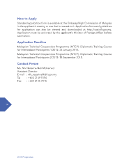 How to Apply Standard application form is available at the Embassy/High Commission of Malaysia in the applicant’s country or one that is nearest to it. Application form and guidelines for application can also be viewed and downloaded at http://cas.idfr.gov.my. Application must be endorsed by the applicant’s Ministry of Foreign Affairs before submission. Application Deadline Malaysian Technical Cooperation Programme (MTCP): Diplomatic Training Course for International Participants 1/2015: 23 January 2015. Malaysian Technical Cooperation Programme (MTCP): Diplomatic Training Course for International Participants 2/2015: 18 September 2015. Contact Person Ms. Nik Nazarina Nek Mohamed Assistant Director E-mail : nik_nazarina@idfr.gov.my Tel : +603 2149 1154 Fax : +603 2145 7015 14 2015 Prospectus