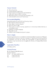 Course Content U Group Dynamics; U Country Report Presentation; U Cross-Cultural Communication and Awareness; U Traits and Criteria of CML Countries; U Negotiations Skills, Techniques and Strategies; and U International Economic and Trade Issues. Prerequisite/Eligibility Interested applicants must fulfl the following criteria: U Nominated by their Government; U Have a basic university degree; U Below 35 years of age; U Three years or more of working experience in international affairs/relations or international trade; U Profcient in English language; U Medically ft; and U Ability to work independently and in groups. How to Apply Standard application form is available at the Embassy/High Commission of Malaysia in the applicant’s country or one that is nearest to it. Application form and guidelines for application can also be viewed and downloaded at http://cas.idfr.gov.my. Application must be endorsed by the applicant’s Ministry of Foreign Affairs before submission. 16 Application Deadline 20 February 2015. Contact Person Ms. Nik Nazarina Nek Mohamed Assistant Director E-mail : nik_nazarina@idfr.gov.my Tel : +603 2149 1154 Fax : +603 2145 7015 2015 Prospectus