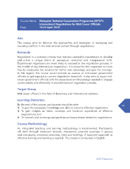 Course Name Malaysian Technical Cooperation Programme (MTCP): International Negotiations for Mid-Career Offcials Date 13-24 April 2015 Aim The course aims to discover the approaches and strategies in managing and resolving conficts in the international context through negotiations. Rationale Negotiation is a complex process that requires successful practitioners to develop and utilise a unique blend of perceptual, analytical and interpersonal skills. Experienced negotiators are more likely to succeed in the negotiation process. In the middle of any international negotiation, it is crucial for the negotiator to know how to manipulate the situation to his/her own advantage and gain the leverage. In this regard, this course would provide an avenue to mid-career government offcials to get exposed to current negotiation essentials. It also aims to equip mid- career government offcials with the experience and knowledge needed to engage constructively and effectively in any international negotiation process. Target Group Mid-career offcers in the feld of diplomacy and international relations. Learning Outcomes By the end of this course, participants should be able: 17 U To gain the necessary knowledge and skills to become effective negotiators; U To gain insights on ideas, concepts and hands-on experience of effective negotiations; and U To network and exchange perspectives and experiences related to negotiations. Course Methodology An integrated teaching and learning methodology is implemented. Participants will learn through classroom lectures, discussions, practical exercises in groups and individually, simulation exercises, visits and briefngs. A balanced approach to effective training and learning is applied. This course is conducted in English. 2015 Prospectus