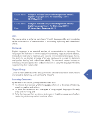 Course Name Malaysian Technical Cooperation Programme (MTCP): English Language Course for Diplomacy 1/2015 Date 18-29 May 2015 Course Name Malaysian Technical Cooperation Programme (MTCP): English Language Course for Diplomacy 2/2015 Date 23 November-4 December 2015 Aim The course aims to enhance participants’ English language skills and knowledge as the main medium of communication in conducting diplomacy and international affairs. Rationale English language is an essential medium of communication in diplomacy. The language is the main tool of communication in conducting negotiations and debates, bilateral and multilateral meetings, and regional or international dialogues. Hence, the ability to use English language effectively has become an asset to diplomats and parties dealing with international affairs. The two-week course focuses on enhancing the participants’ skills and competencies in using the language effectively in performing their tasks better. Target Group Junior to mid-career diplomats and government offcers whose tasks and functions are related to diplomacy and international relations. 19 Learning Outcomes By the end of this course, participants should be able: U To enhance their general English language profciency in the areas of listening, speaking, reading and writing; U To know the techniques and strategies of using English language effectively orally and in writing; and U To further improve their profciency in the use of English language specifcally in conducting diplomacy and international affairs. 2015 Prospectus