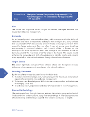Course Name Malaysian Technical Cooperation Programme (MTCP): Crisis Management for International Participants 2015 Date 1-19 June 2015 Aim The course aims to provide holistic insights on theories, strategies, elements and issues related to crisis management. Rationale As an integral part of international relations, crisis management is the ability of individuals and states to respond to challenges with strategies and policy choices that would enable them to overcome present threats and dangers and turn them around for future betterment. Every so often it may cut across many disciplines encompassing international relations and domestic affairs. It focuses on the techniques and skills required to assess and manage a crisis situation as well as to try to prevent the recurrence of similar crisis in the future. This course would enhance the knowledge and skills of participants to identify, resolve and prevent crisis, especially in international relations through alternative mechanisms. Target Group Mid-career diplomats and government offcers whose job description involves diplomacy, crisis management, security and international relations. Learning Outcomes 22 By the end of this course, the participants should be able: U To enhance their knowledge and understanding on the theoretical and practical aspects of international crisis and crisis management; U To increase their knowledge and skills in the various approaches and techniques in managing crisis; and U To exchange views, experiences and ideas on areas related to crisis management. Course Methodology The participants learn through classroom lectures, discussions, group and individual in-class exercises and simulations, study visits and briefngs. A balanced approach to effective training and learning is applied. This course is conducted in English. 2015 Prospectus