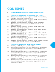 CONTENTS 7 INSTITUTE OF DIPLOMACY AND FOREIGN RELATIONS (IDFR) DIPLOMATIC TRAINING FOR INTERNATIONAL PARTICIPANTS 12 Malaysian Technical Cooperation Programme (MTCP): Diplomatic Training Course for International Participants 1/2015 12 Malaysian Technical Cooperation Programme (MTCP): Diplomatic Training Course for International Participants 2/2015 15 Malaysian Technical Cooperation Programme (MTCP): Negotiating International Economic Agreements for CML Countries (Cambodia, Myanmar and Laos) 17 Malaysian Technical Cooperation Programme (MTCP): International Negotiations for Mid-Career Offcials 19 Malaysian Technical Cooperation Programme (MTCP): English Language Course for Diplomacy 1/2015 19 Malaysian Technical Cooperation Programme (MTCP): English Language Course for Diplomacy 2/2015 22 Malaysian Technical Cooperation Programme (MTCP): Crisis Management for International Participants 2015 25 Malaysian Technical Cooperation Programme (MTCP): Strategic Analysis for International Participants 2015 28 Malaysian Technical Cooperation Programme (MTCP): Executive Workshop on Diplomacy and Security for Senior Government Offcials DIPLOMATIC TRAINING FOR MALAYSIAN PARTICIPANTS 3 32 Workshop on Public Diplomacy and Media Skills 34 Pre-Posting Orientation Course for Home Based Staff and Spouses under Sistem Pentadbiran Kerajaan Malaysia di Luar Negara (SPKM) 1/2015 (Grade 41 and above) 34 Pre-Posting Orientation Course for Home Based Staff and Spouses under Sistem Pentadbiran Kerajaan Malaysia di Luar Negara (SPKM) 2/2015 (Grade 38 and below) 34 Pre-Posting Orientation Course for Home Based Staff and Spouses under Sistem Pentadbiran Kerajaan Malaysia di Luar Negara (SPKM) 3/2015 (Grade 41 and above) 34 Pre-Posting Orientation Course for Home Based Staff and Spouses under Sistem Pentadbiran Kerajaan Malaysia di Luar Negara (SPKM) 4/2015 (Grade 38 and below) 2015 Prospectus