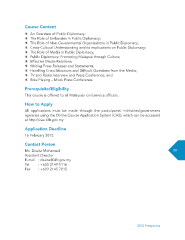 Course Content U An Overview of Public Diplomacy; U The Role of Embassies in Public Diplomacy; U The Role of Non-Governmental Organisations in Public Diplomacy; U Cross-Cultural Understanding and its Implications on Public Diplomacy; U The Role of Media in Public Diplomacy; U Public Diplomacy: Promoting Malaysia through Culture; U Effective Media Relations; U Writing Press Releases and Statements; U Handling Crisis Situations and Diffcult Questions from the Media; U TV and Radio Interview and Press Conference; and U Role Playing – Mock Press Conference. Prerequisite/Eligibility This course is offered to all Malaysian civil service offcers. How to Apply All applications must be made through the participants’ ministries/government agencies using the Online Course Application System (CAS), which can be accessed at http://cas.idfr.gov.my Application Deadline 16 February 2015. Contact Person Ms. Dzuita Mohamed 33 Assistant Director E-mail : dzuita@idfr.gov.my Tel : +603 2149 1116 Fax : +603 2145 7015 2015 Prospectus