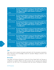 Course Name Pre-Posting Orientation Course for Home Based Staff and Spouses under Sistem Pentadbiran Kerajaan Malaysia di Luar Negara (SPKM) 1/2015 (Grade 41 and above) Date 2-13 March 2015 Course Name Pre-Posting Orientation Course for Home Based Staff and Spouses under Sistem Pentadbiran Kerajaan Malaysia di Luar Negara (SPKM) 2/2015 (Grade 38 and below) Date 6-10 April 2015 Course Name Pre-Posting Orientation Course for Home Based Staff and Spouses under Sistem Pentadbiran Kerajaan Malaysia di Luar Negara (SPKM) 3/2015 (Grade 41 and above) Date 11-22 May 2015 Course Name Pre-Posting Orientation Course for Home Based Staff and Spouses under Sistem Pentadbiran Kerajaan Malaysia di Luar Negara (SPKM) 4/2015 (Grade 38 and below) Date 8-12 June 2015 Course Name Pre-Posting Orientation Course for Home Based Staff and Spouses under Sistem Pentadbiran Kerajaan Malaysia di Luar Negara (SPKM) 5/2015 (Grade 41 and above) Date 17-28 August 2015 Course Name Pre-Posting Orientation Course for Home Based Staff and 34 Spouses under Sistem Pentadbiran Kerajaan Malaysia di Luar Negara (SPKM) 6/2015 (Grade 41 and above) Date 19-30 October 2015 Aim The course aims to prepare and equip participants with the necessary preparation, skills, information and knowledge needed to represent Malaysia abroad in their various capacities. Rationale The SPKM Pre-Posting Orientation Course for Home Based Staff and Spouses is conducted to prepare offcers and their spouses who are going to be assigned abroad for the frst time. It is mandated under the Sistem Pentadbiran Kerajaan 2015 Prospectus