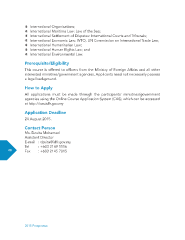 U International Organisations; U International Maritime Law: Law of the Sea; U International Settlement of Disputes: International Courts and Tribunals; U International Economic Law: WTO, UN Commission on International Trade Law; U International Humanitarian Law; U International Human Rights Law; and U International Environmental Law. Prerequisite/Eligibility This course is offered to offcers from the Ministry of Foreign Affairs and all other interested ministries/government agencies. Applicants need not necessarily possess a legal background. How to Apply All applications must be made through the participants’ ministries/government agencies using the Online Course Application System (CAS), which can be accessed at http://cas.idfr.gov.my Application Deadline 24 August 2015. Contact Person Ms. Dzuita Mohamed Assistant Director E-mail : dzuita@idfr.gov.my Tel : +603 2149 1116 40 Fax : +603 2145 7015 2015 Prospectus
