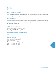 Duration Three days. Prerequisite/Eligibility This course is offered to all offcers from the Ministry of Foreign Affairs and other ministries/government agencies. How to Apply All applications must be made through the participants’ ministries/government agencies using the Online Course Application System (CAS) which can be accessed at http://cas.idfr.gov.my Application Deadline Say it Right 1/2015: 15 January 2015. Say it Right 2/2015: 10 July 2015. Maximum Number of Participants 25 Contact Person Ms. Wan Faizah Wan Yusoff Deputy Director E-mail : wanfaizah@idfr.gov.my Tel : +603-2149 1032 Fax : +603-2144 8704 47 2015 Prospectus