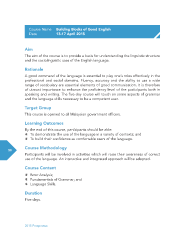 Course Name Building Blocks of Good English Date 13-17 April 2015 Aim The aim of the course is to provide a basis for understanding the linguistic structure and the sociolinguistic uses of the English language. Rationale A good command of the language is essential to play one’s roles effectively in the professional and social domains. Fluency, accuracy and the ability to use a wide range of vocabulary are essential elements of good communication. It is therefore of utmost importance to enhance the profciency level of the participants both in speaking and writing. The fve-day course will touch on some aspects of grammar and the language skills necessary to be a competent user. Target Group This course is opened to all Malaysian government offcers. Learning Outcomes By the end of this course, participants should be able: U To demonstrate the use of the language in a variety of contexts; and U To build their confdence as comfortable users of the language. Course Methodology 50 Participants will be involved in activities which will raise their awareness of correct use of the language. An interactive and integrated approach will be adopted. Course Content U Error Analysis; U Fundamentals of Grammar; and U Language Skills. Duration Five days. 2015 Prospectus