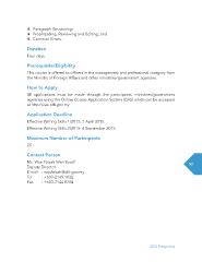 U Paragraph Structuring; U Proofreading, Reviewing and Editing; and U Common Errors. Duration Four days. Prerequisite/Eligibility This course is offered to offcers in the management and professional category from the Ministry of Foreign Affairs and other ministries/government agencies. How to Apply All applications must be made through the participants’ ministries/government agencies using the Online Course Application System (CAS) which can be accessed at http://cas.idfr.gov.my Application Deadline Effective Writing Skills 1/2015: 2 April 2015. Effective Writing Skills 2/2015: 4 September 2015. Maximum Number of Participants 25 Contact Person Ms. Wan Faizah Wan Yusoff 53 Deputy Director E-mail : wanfaizah@idfr.gov.my Tel : +603-2149 1032 Fax : +603-2144 8704 2015 Prospectus