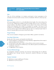 Course Name Workshop on Communicating Across Cultures Date 9-11 June 2015 Aim The aim of the workshop is to develop participants’ critical awareness on the processes of communication across cultures and between different cultural groups. Rationale All human beings conform to a culturally determined reality. Our culture shapes the way we “see” reality. Having effective communication skills is a must in any position, in any business. The ability to navigate across cultural lines and to communicate fexibly and sensitively with others is a standard for success. The focus of this workshop is on developing an understanding of the secrets of communication across cultures and the ways in which different groups seek to understand each other in terms of representations and cross-cultural encounters. Target Group This course is opened to Malaysian government offcers, grade 41 and above. Learning Outcomes By the end of this course, participants should be able: U To demonstrate an understanding of key theoretical approaches and concepts in communicating across cultures; U To identify the main ways in which culture affects communication process; 54 U To state the similarities and differences in the cultural systems and behaviours in a systematic way; and U To appreciate culture diversity. Course Methodology An integrated interactive teaching and learning methodology will be adopted. Participants learn through lectures, discussions, practical exercises and group activities. Course Content U Defnitions, Impact and Scope of Culture; U Elements of Communication; 2015 Prospectus
