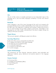Course Name Arabic Level XII Date 12 January-14 December 2015 Aim The aim of the course is to enable participants to be independent users of the language and to use the Arabic language confdently in formal and informal situations. Rationale Arabic language is one of the major languages of the world, and mastering the language will help towards a better understanding of the Arabic culture and people. It is also vital in the expansion of business and building of relationship and as a tool of communication among Arabic speaking communities. Knowledge of the language too, can instil a better understanding of the Islamic religion through the reading of Al Quran and Sunnah. Target Group This course is opened to all Malaysian government offcers. Learning Objectives By the end of this course, participants should be able: U To express their opinion in the target language; U To read long and complicated texts; U To understand speeches; 60 U To enquire for information; and U To write messages. Course Methodology The participants will learn through classroom activities using textbooks and audiovisual materials, group interactions and practice sessions in the language laboratory. Course Content U Dictionary Skills; U Analysis of Longer Reading Texts; U Free Writing; and U Grammar. 2015 Prospectus