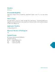 Duration 84 hours. Prerequisite/Eligibility Applicants should have successfully completed Arabic Level XI or an equivalent level. How to Apply All applications must be made through the participants’ ministries/government agencies using the Online Course Application System (CAS) which can be accessed at http://cas.idfr.gov.my Application Deadline 11 December 2014. Maximum Number of Participants 20 Contact Person Mr. Hassan Mohamad Ali @ Mat Ali Assistant Director E-mail : hassan@idfr.gov.my Tel : +603-2149 1036 Fax : +603-2144 8704 61 2015 Prospectus