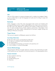 Course Name Arabic Level VIII Date 13 January-4 June 2015 Aim The aim of the course is to equip participants with a working knowledge of Arabic so as to enable them to use the language both orally and in writing, to cope with their daily needs. Rationale Arabic language is one of the major languages of the world, and mastering the language will help towards a better understanding of the Arabic culture and people. It is also vital in the expansion of business and building of relationship and as a tool of communication among Arabic speaking communities. Knowledge of the language too, can instil a better understanding of the Islamic religion through the reading of Al Quran and Sunnah. Target Group This course is opened to all Malaysian government offcers. Learning Outcomes By the end of this course, participants should be able: U To read and understand intermediate level texts; U To write dictation; U To understand intermediate conversation and speeches; and 62 U To be confdent in using the languages. Course Methodology The participants will learn through classroom activities using textbooks and audio- visual materials, group interactions and practice sessions in the language laboratory. Course Content U Short Texts for Listening; U Short Stories; U Guided Writing; and U Grammar. 2015 Prospectus