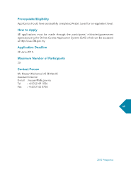 Prerequisite/Eligibility Applicants should have successfully completed Arabic Level I or an equivalent level. How to Apply All applications must be made through the participants’ ministries/government agencies using the Online Course Application System (CAS) which can be accessed at http://cas.idfr.gov.my Application Deadline 28 June 2015. Maximum Number of Participants 20 Contact Person Mr. Hassan Mohamad Ali @ Mat Ali Assistant Director E-mail : hassan@idfr.gov.my Tel : +603-2149 1036 Fax : +603-2144 8704 69 2015 Prospectus