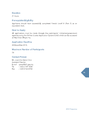 Duration 21 hours. Prerequisite/Eligibility Applicants should have successfully completed French Level VI (Part 1) or an equivalent level. How to Apply All applications must be made through the participants’ ministries/government agencies using the Online Course Application System (CAS) which can be accessed at http://cas.idfr.gov.my Application Deadline 20 December 2014. Maximum Number of Participants 20 Contact Person Ms. Jeanette Daina Chen Assistant Director E-mail : janet@idfr.gov.my Tel : +603-2149 1034 Fax : +603-2144 8704 75 2015 Prospectus