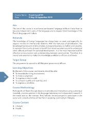 Course Name French Level VII Date 5 May-15 September 2015 Aim The aim of the course is to enhance participants’ language skills and help them to become independent users of the language and to expand their knowledge of the French language and culture. Rationale The knowledge of foreign languages has always been an asset and especially for anyone involved in international relations. With the fast pace of globalisation, this knowledge has become vital in all areas; to expand business, to further one’s studies, to represent the country abroad, to beneft from travel experiences and to understand other cultures and even for personal development. It is the most important tool for effective communication and understanding between communities. Therefore, it is natural and essential to make this knowledge available to offcers at all levels. Target Group The programme is opened to all Malaysian government offcers. Learning Objectives By the end of this course, participants should be able: U To describe the living environment; U To make a judgment; 80 U To express a need or wish; U To compare quality and quantity; and U To express a condition. Course Methodology Participants will learn through classroom activities and interactions using audiovisual materials, practice sessions in the language laboratory and independent research in the media and on the internet. They will also be encouraged to participate in the social and cultural activities of the French speaking community in Malaysia. Course Content U Lifestyle; U Health; 2015 Prospectus