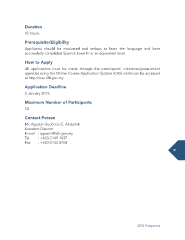 Duration 42 hours. Prerequisite/Eligibility Applicants should be motivated and serious to learn the language and have successfully completed Spanish Level III or an equivalent level. How to Apply All applications must be made through the participants’ ministries/government agencies using the Online Course Application System (CAS) which can be accessed at http://cas.idfr.gov.my Application Deadline 2 January 2015. Maximum Number of Participants 20 Contact Person Mr. Agustín Gutiérrez C. Abdullah Assistant Director E-mail : agustin@idfr.gov.my Tel : +603-2149 1037 Fax : +603-2144 8704 91 2015 Prospectus