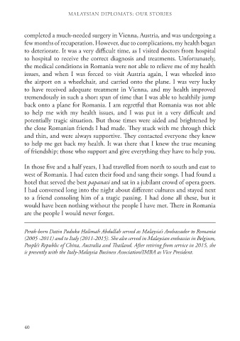 Perak-born Datin Paduka Halimah Abdullah served as Malaysia’s Ambassador to Romania