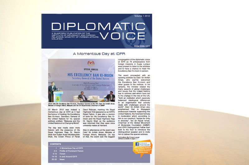 In 2012, IDFR has extended the Diplomatic Voice to a total of 32 pages for an enhanced and stimulating reading experience. Published quarterly, the Diplomatic Voice which was introduced in 2011, aim to create a platform for the sharing and disseminating of information and knowledge among practitioners of diplomacy.